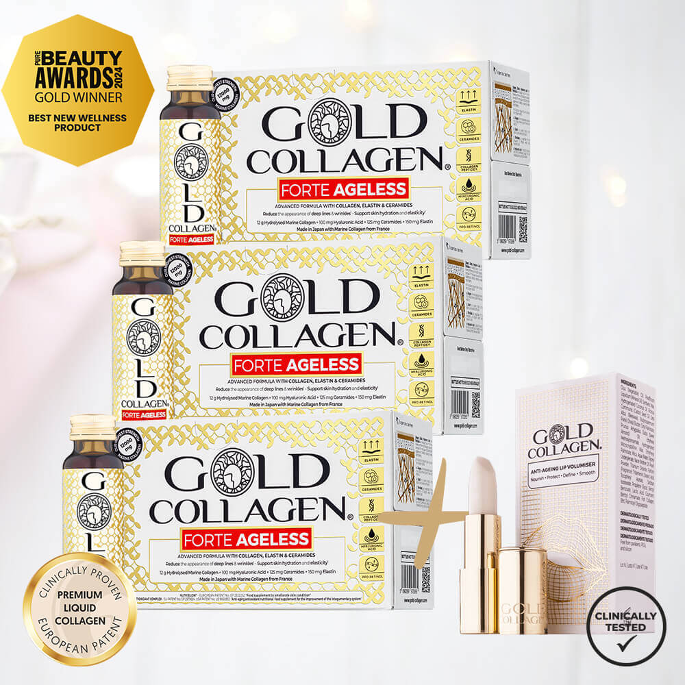 3 Gold Collagen FORTE AGELESS dėžutės (rekomenduojamas mėnesio kursas) + 25 eur DOVANA Gold Collagen lūpų balzamas. Nemokamas pristatymas. TOP geriamas kolagenas odai, nuo oksidacinio streso, energijos trūkumo